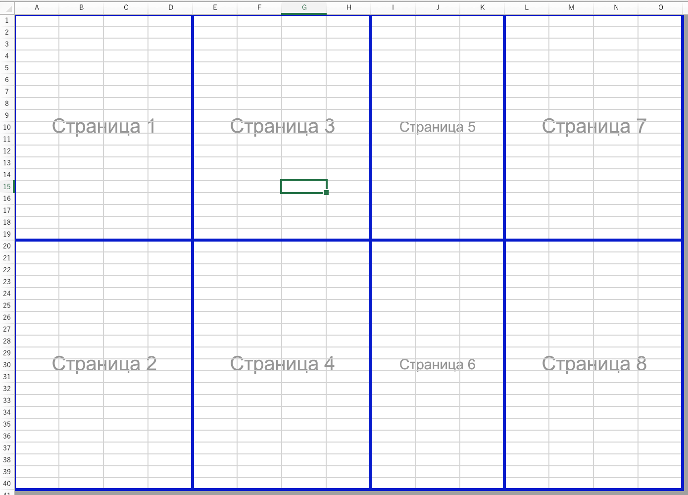 - Выберите команду Вставка › Разрыв страницы (Insert › Page Break). На листе появятся две новые линии деления на страницы. Одна слева от выделенной ячейки, а вторая – сверху. Теперь лист будет печататься на четырех страницах.