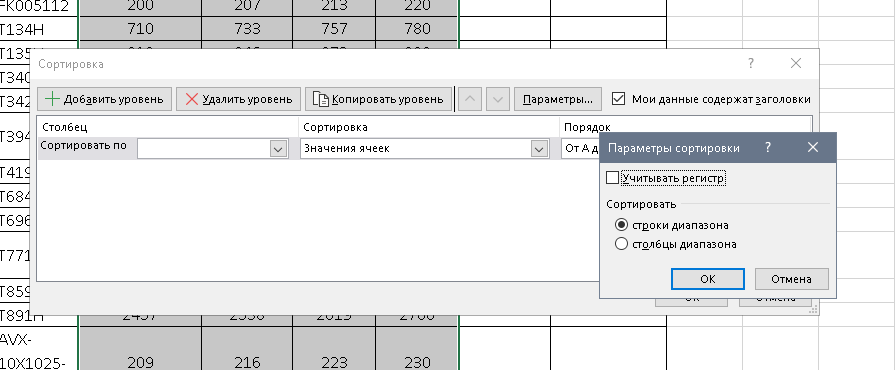 Выделяем нужные столбцы вместе с добавленной номинацией и запускаем настраиваемую сортировку. В частности, это можно сделать с вкладки «Данные». Заходим в параметры и а выбираем вариант «Сортировать по столбцам диапазона»