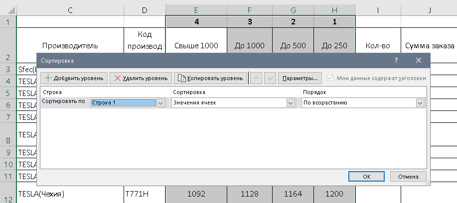 добавляем строку с нужным порядком столбцов. Ее можно добавить как выше заголовка таблицы, так и под ней. Выберем первый вариант.