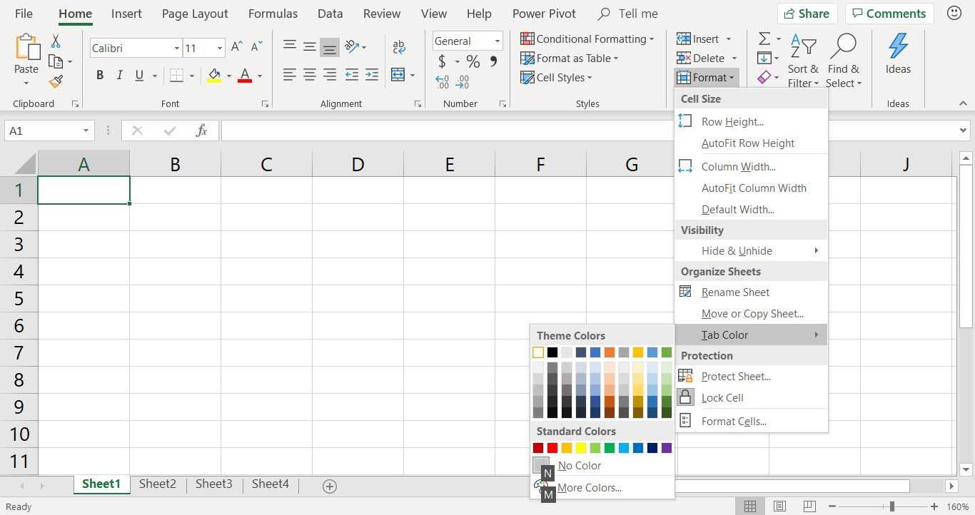 Перейдите в раздел Домашняя страница > Формат > вкладка Цвет и выберите цвет из цветовой палитры, чтобы изменить цвет всех выбранных листов.