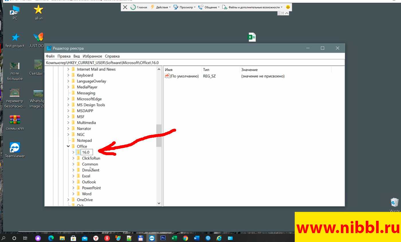 - переходим в ветку HKEY_CURRENT_USERSoftwareMicrosoftOffice16.0 (у вас может быть другая цифра быть, это зависит от версии Office)