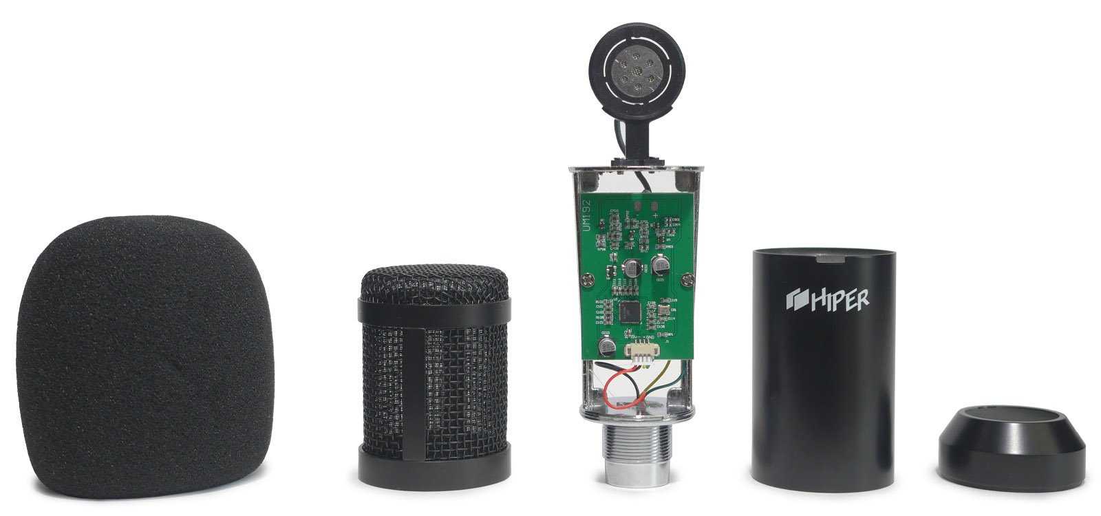Корпус микрофона легко разбирается. Для этого необходимо открутить нижнее конусное кольцо. Сделать это можно рукой. После чего корпус разделяется на несколько частей. Верхняя сеточка прикручена к внутренней металлической раме двумя саморезами.