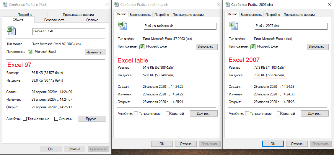 Excel 97 — Формат двоичных файлов, бинарник (biff8), про сжатие тут не слышали и потому вес файла столь велик. В отличии от более позднего XML, формат 97 года поддерживает все виды изображений.Excel table (XML) — Ранняя версия XLSX, где данные хранятся как простые одиночные монолитные XML-файлы, что делает их довольно большими, по сравнению с OOXML и устаревшими двоичными форматами Microsoft Office. Но на скриншоте вес минимален — возмутился бы каждый! Ответ прост, данный вес указан за документ, где отображаться будет только текст. А теперь представьте, если бы тут всё-таки была поддержка картинок, да он бы занимал кучу места, ведь о сжатии на этом моменте всё ещё никто не знает. Кроме того, встроенные элементы, такие как изображения, хранятся в виде двоичных закодированных блоков, но недоступны для отображения. Excel 2007 XLSX (XML) — Microsoft взяли лучшее от прошлых форматов и внедрили сжатие файлов. Размер документа приблизительно на 50-75 процентов меньше, чем в предыдущих версиях.
