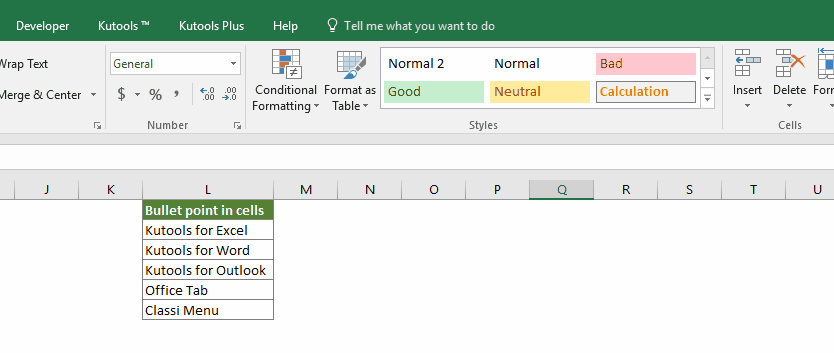 Цена на Вставить пулю полезности Kutools for Excel помогает быстро вставлять маркеры в ячейки диапазона или нескольких диапазонов всего за несколько щелчков мышью. См. Демонстрацию ниже: Скачайте и попробуйте прямо сейчас! (30-дневная бесплатная трасса)
