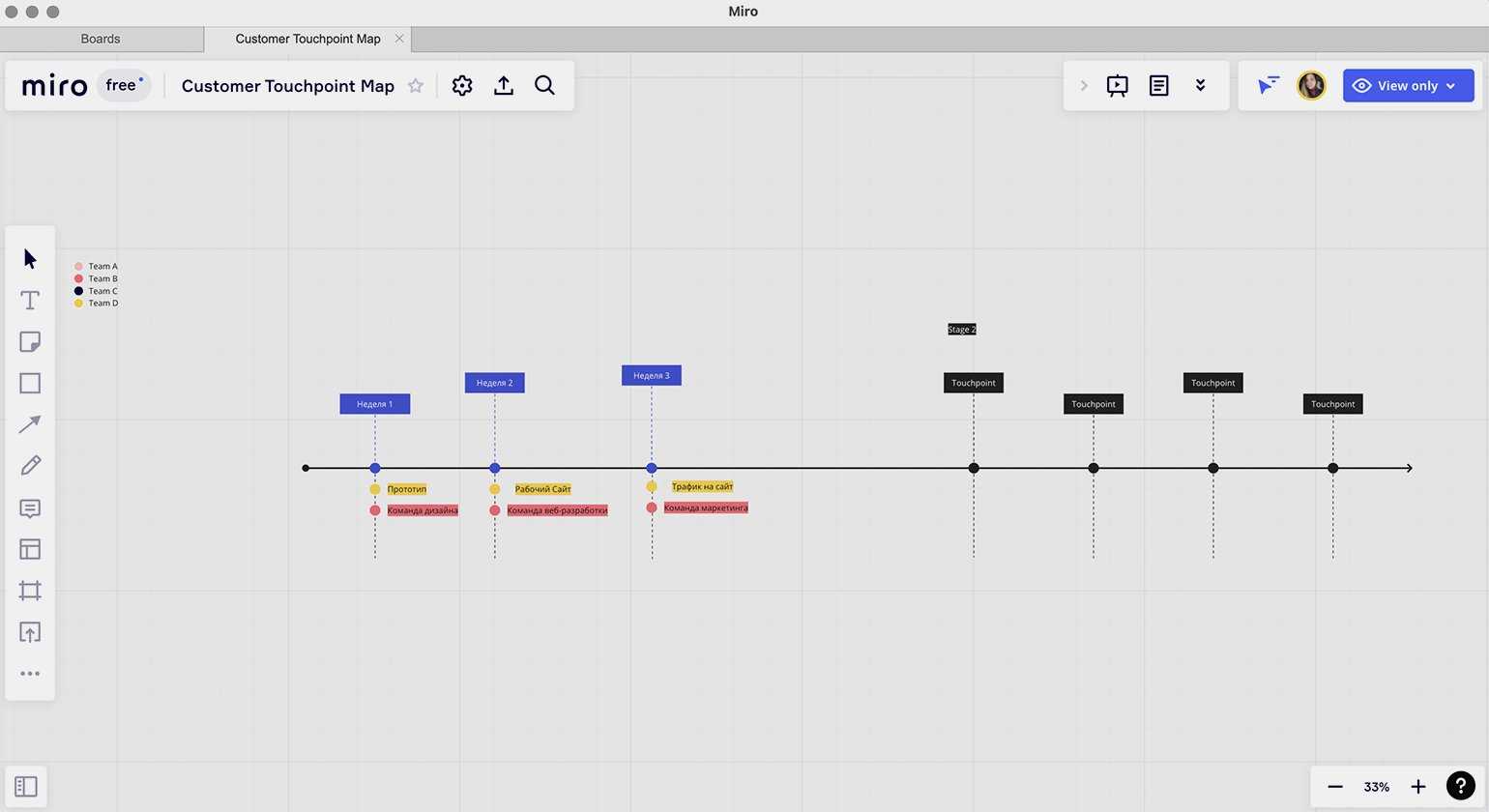 Miro — сервис для совместной работы команд. В нём можно полностью самостоятельно составить дорожную карту на собственной онлайн-доске или воспользоваться уже готовыми шаблонами. Вот пример шаблона дорожной карты в виде временной линии с контрольными точками, где прописаны основные процессы проекта и ответственные исполнители.