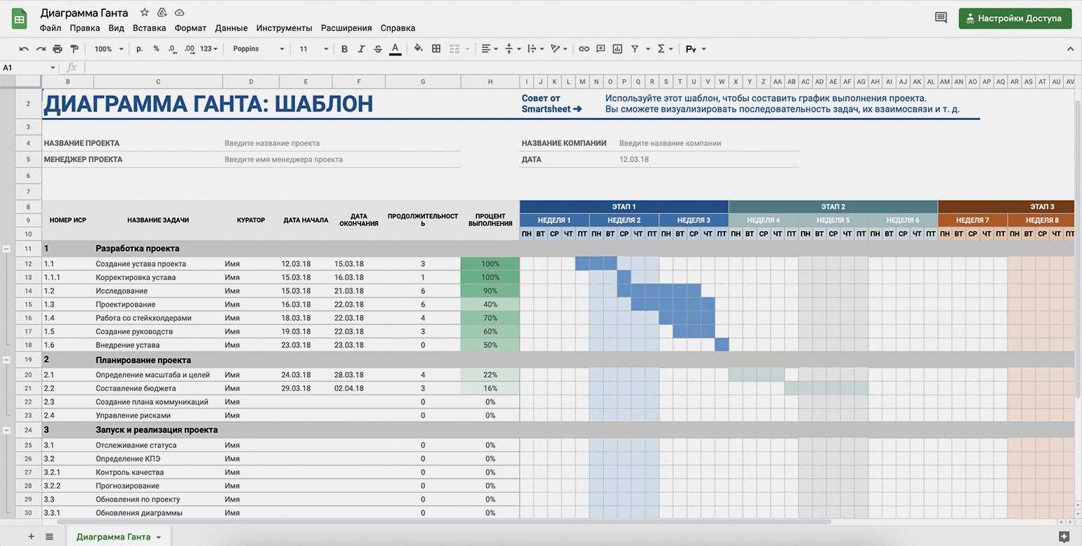 Один из распространённых методов создания дорожных карт в таблицах — диаграммы Ганта. Подробно мы разбирали этот инструмент здесь.