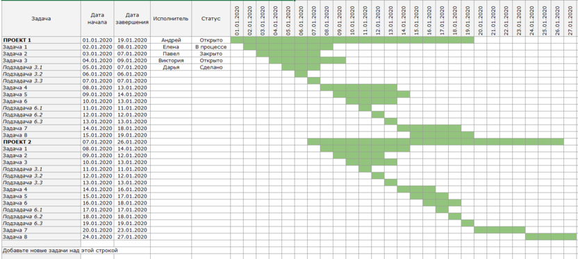 Диаграмма Gantt (Ганта) – это графическое представление сроков выполнения задач и их взаимосвязей.