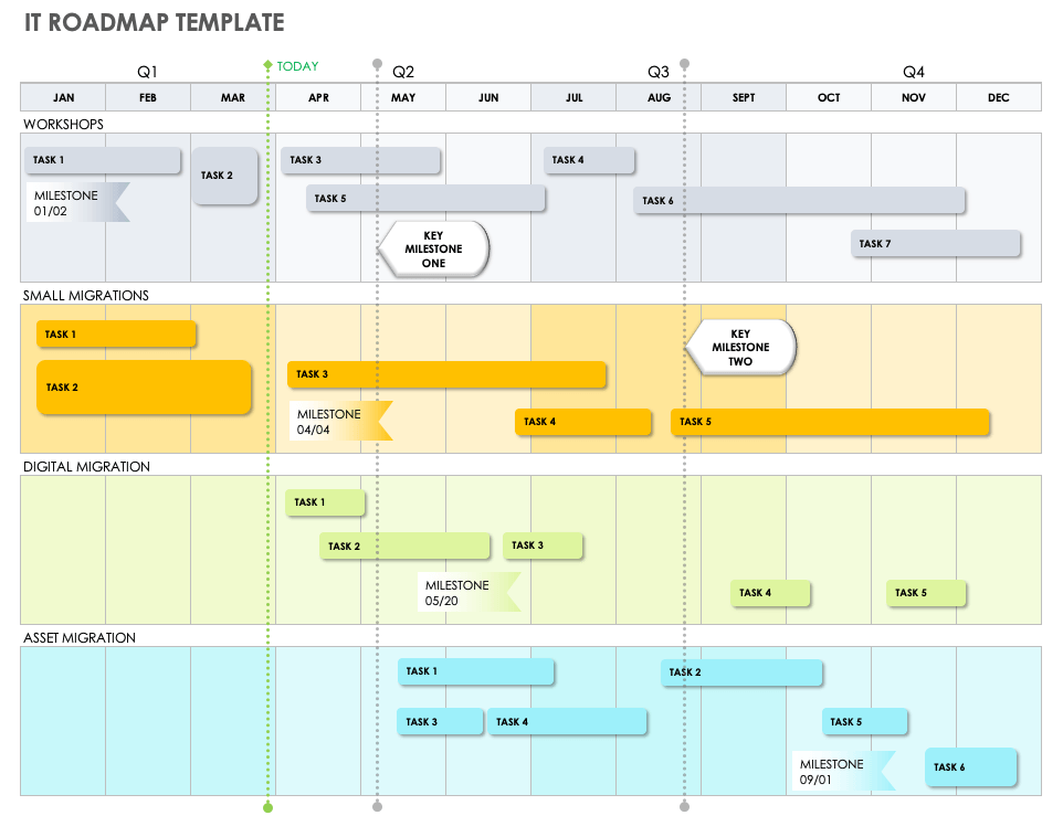 This IT roadmap template provides an easy way to plan and track project tasks associated with an IT initiative, such as app upgrades or product launches. You’ll find space to add key details such as milestones, start and end dates via expandable task bars, and go-live dates, so you can accurately plan, track, and share your IT roadmap with all necessary stakeholders.