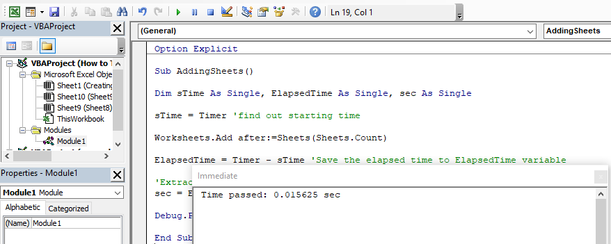Now, Debug.Print option is great for us because it will give us the information that we need (the time spent creating a sheet) without having to store this information in a variable or without showing it in a message box.