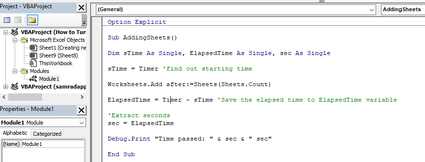 Now, for the final part, we will use the Debug.Print option to show us the time that it took for our sheet to be created:
