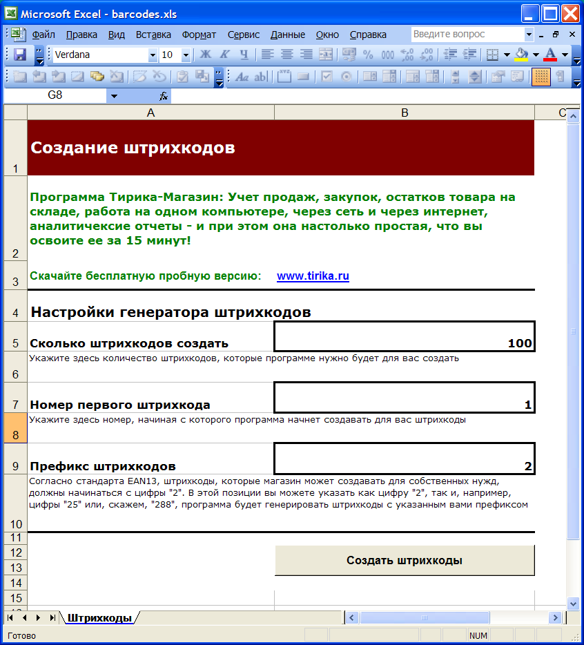 Генератор штрих кодов, описание которого вы сейчас читаете, тоже является файлом Excel с внедренными макросами. Мы знаем, что в этом файле вредоносного кода нет (вообще, наша задача — продать вам в конце концов программу Тирика-Магазин, а не заразить ваш компьютер), но доверять ли этим словам — решать вам. Если вы решили нам не доверять, вы можете дальше не читать эту статью и удалить скачанный файл: к сожалению, без макросов скачанный вами файл для генерации штрихкодов работать не будет.