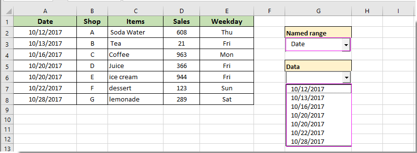 В этом случае я назвал диапазон A2: A8, B2: B8, C2: C8, D2: D8 и E2: E8 как «Дата», «Магазин», «Товары», «Продажи» и «День недели» отдельно.