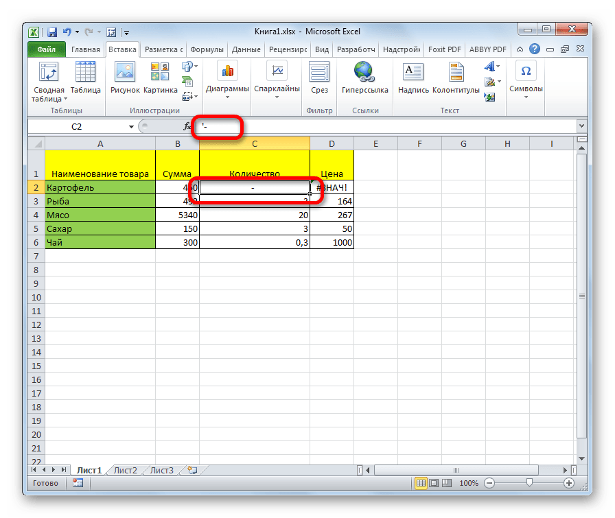 При использовании данного способа это не принципиально важно. Как видим, после этих действий на листе был установлен знак прочерка, а дополнительный символ «’» заметен лишь в строке формул при выделении ячейки.