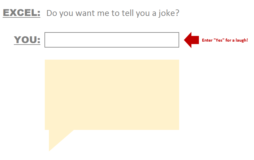 Below is going to be our interface where Excel will reveal a joke if you type the word “Yes” into the blank box (Cell G7).