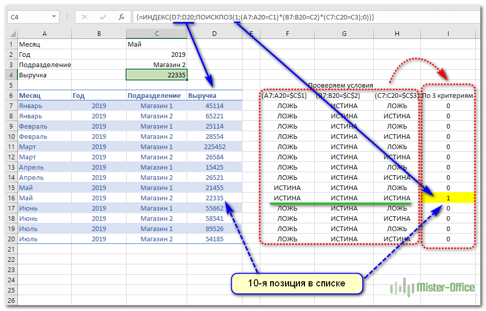 При помощи ПОИСКПОЗ определяем, на какой позиции она находится. На какой позиции находится 1, на той же позиции находится в массиве и искомая сумма выручки. В нашем случае это 10-я строка.