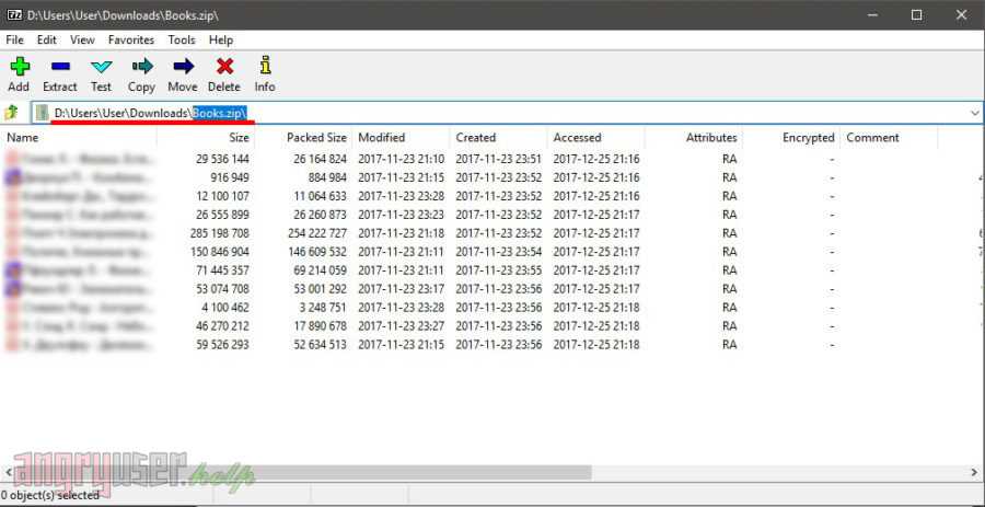 Если у вас уже есть архив, но его размер превышает дозволенный, откройте его архиватором. Далее перейдите на уровень выше, удалив из строки адреса последнее слово. В нашем случае необходимо преобразовать адрес «D:\Users\User\Downloads\Books.zip\» в «D:\Users\User\Downloads».