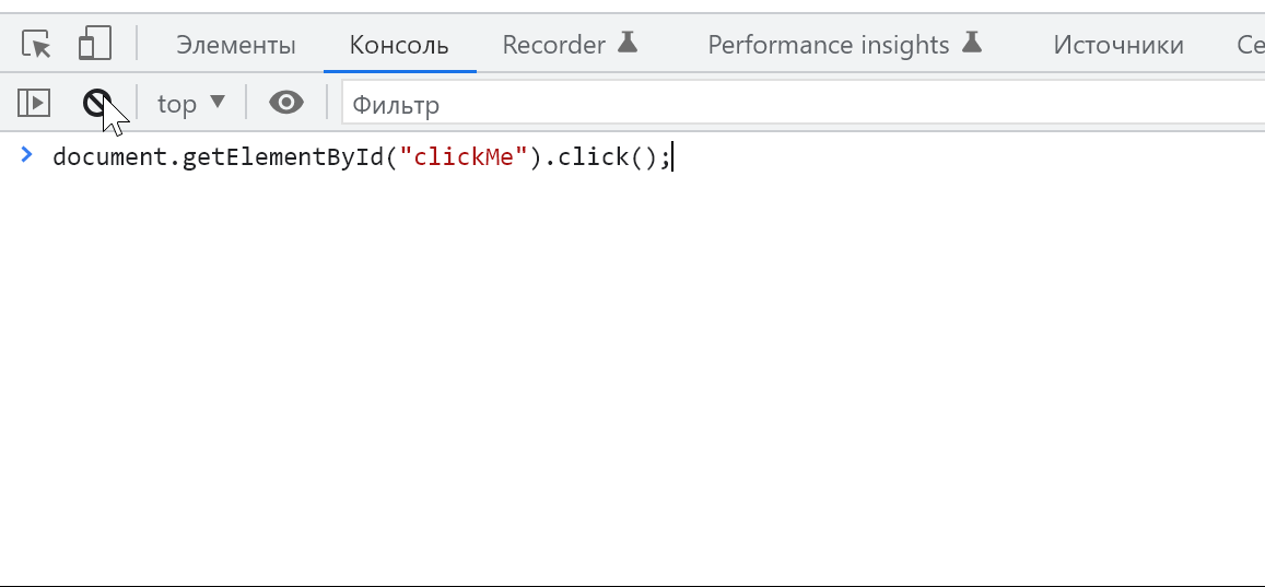 В этой вкладке введите следующую команду document.getElementById(«clickMe»).click(); и нажмите Enter.