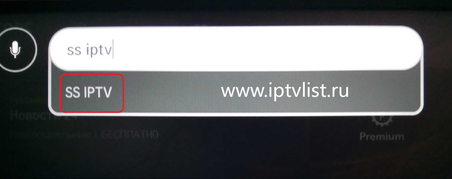 - Кликаем по кнопке «поиск» и вводим название приложения ss iptv. Кликаем по «SS IPTV» в выпадающем списке.