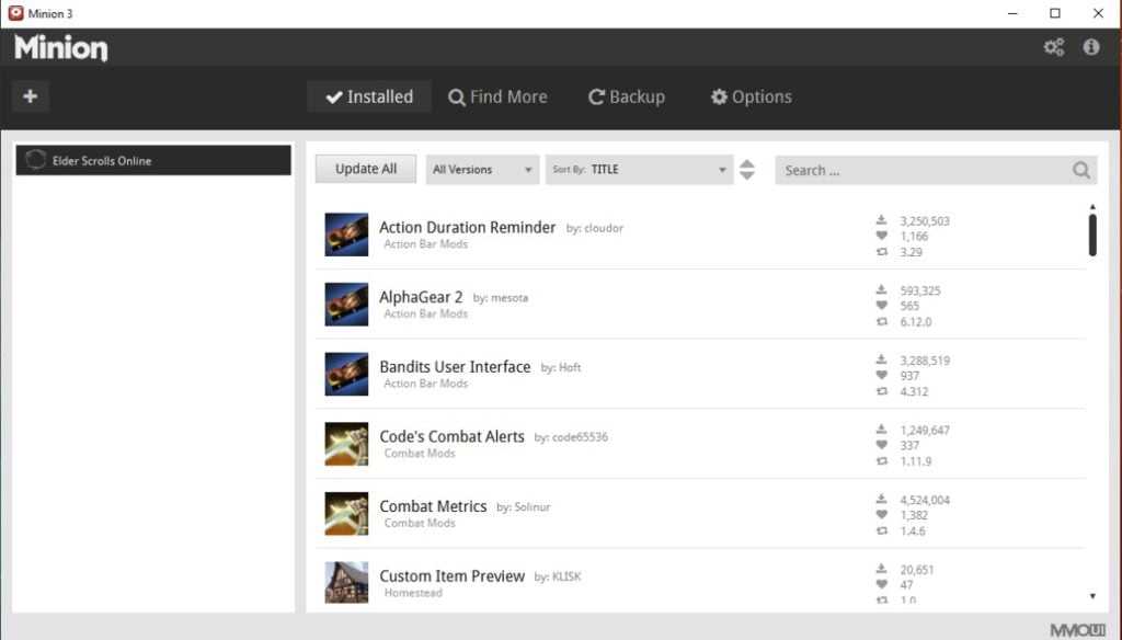 Итак, слева у нас выбрана игра, в нашем случае TESO, в правой части аддоны, которые были установлены. Во вкладке Find More вы сможете искать и устанавливать дополнения, после установки они будут появляться в разделе Installed.