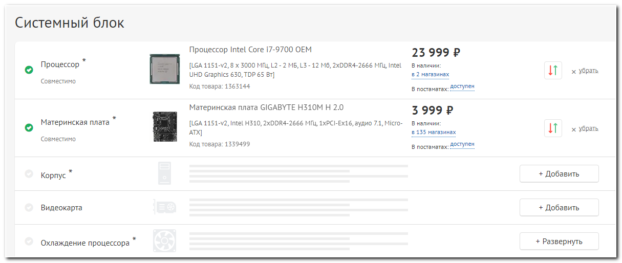 При несовпадении комплектующих компонентов для системного блока они будут подсвечиваться красным. Каждая деталь помечена звездочкой, чтобы не забыть о ней, и пользователь не сможет отправить ПК на сборку, пока не выберет все необходимое оборудование.