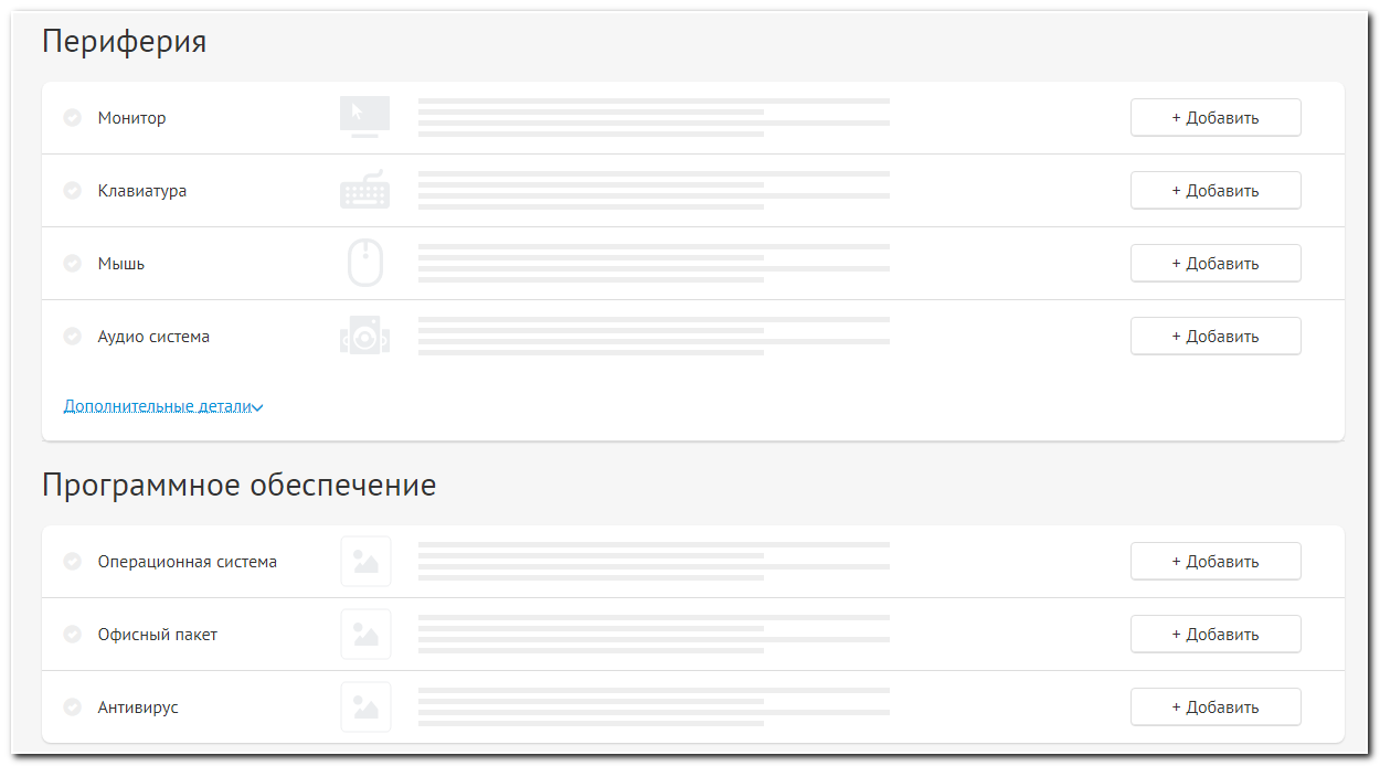 Выбор элементов происходит таким же способом, как подбор комплектующих на сайте. Пользователь выбирает монитор, мышку, клавиатуру, программное обеспечение и антивирус с офисным ПО.