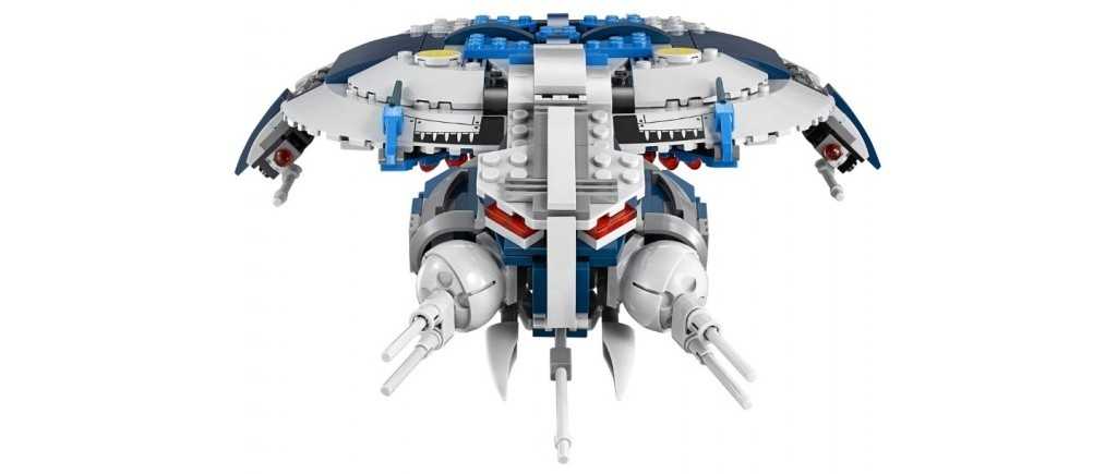 По нижеприведенной схеме Лего вы сможете сделать своими руками истребитель генерала Гривуса. Обтекаемые формы истребителя, внушительная огневая мощь. В этой модели есть двигающаяся кабина, механизм посадки, сворачиваемый хвост, держатели лазерных мечей.