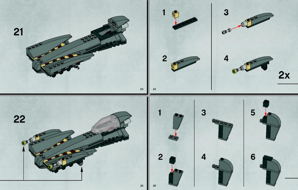 Установите их, как показывает стрелка на рисунке 23. Теперь начинаем собирать лазерные бластеры. Соедините все мелкие детали бластера.