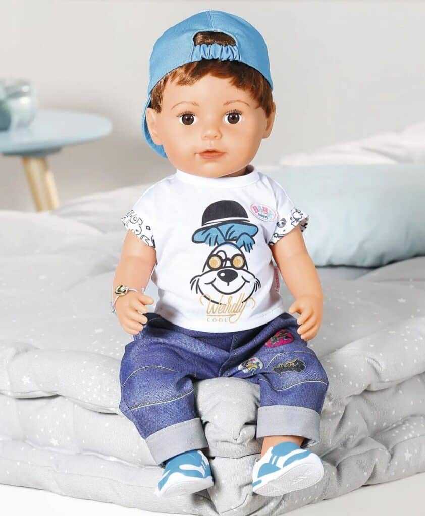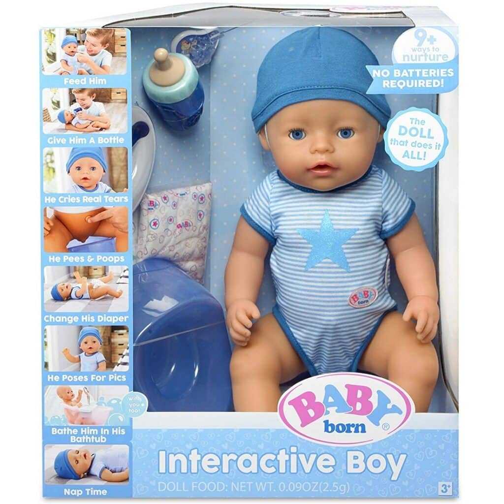 Изначально куклы бебибоны для девочек были миловидными малышками, однако многие считали это несправедливым. Первый интерактивный мальчишка отличается от базовой версии только полом, остальные функции игрушки не изменились. Его наряд и аксессуары, как и подобает мальчику, выполнены в синих оттенках. Мальчик Baby Born чуть легче куклы-девочки, при этом их рост одинаков.