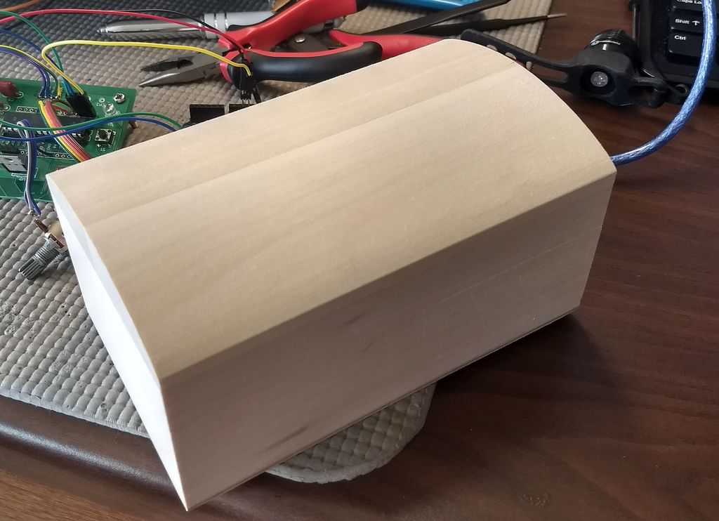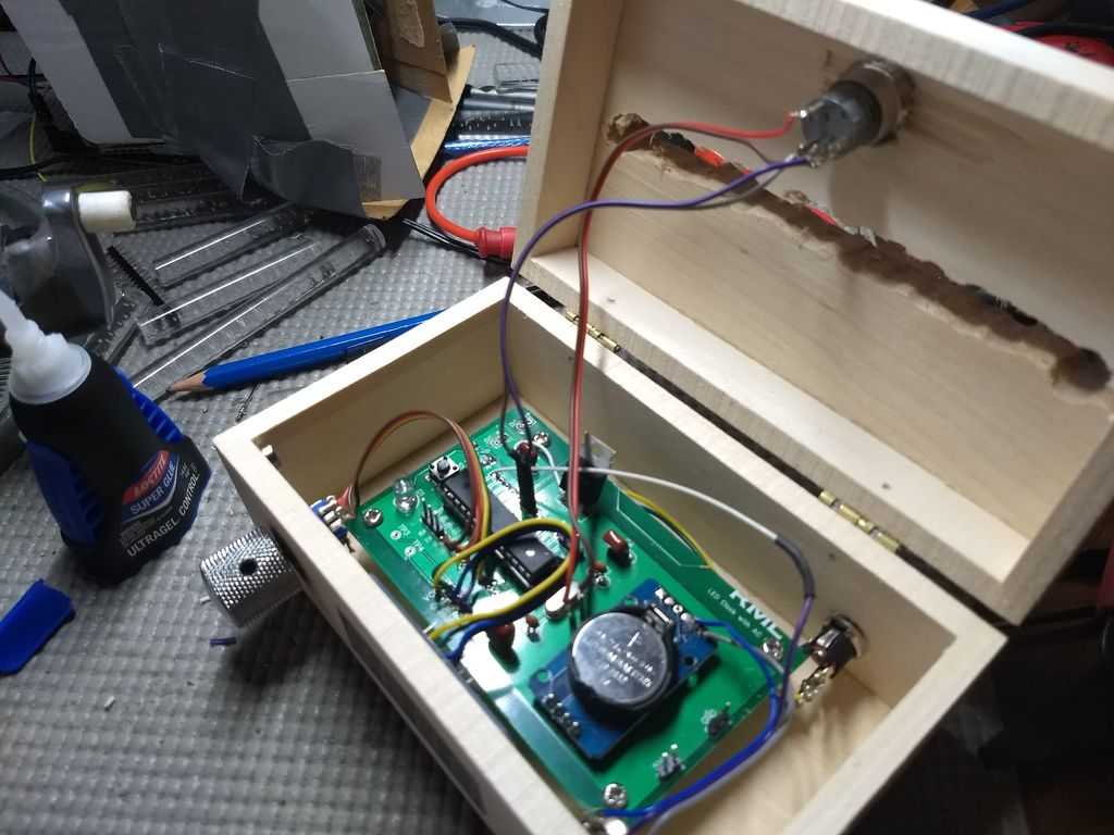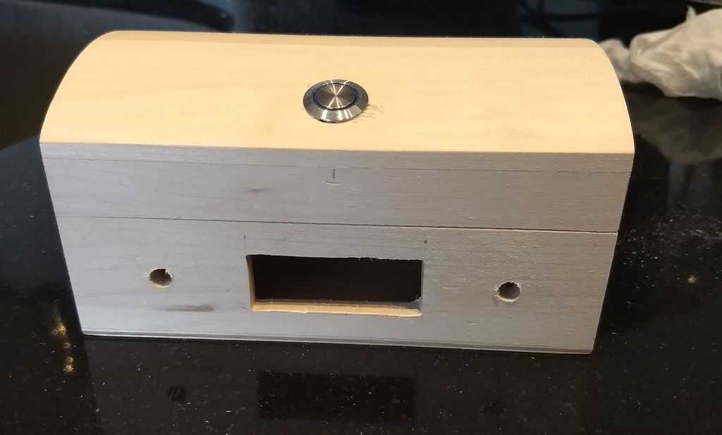 Затем нужно установить всё в шкатулку, вырезать отверстия для акриловых стержней, кнопок, крутилок, дисплея, джека питания и верхней кнопки. Если после установки какие-то элементы будут болтаться, закрепите их горячим клеем.