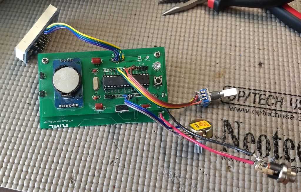 У потенциометра один конец идет на землю (GND), другой на 5V, а средний на аналоговый вход. Крутилки нужно припаять к земле и к двум пинам прерывания (2 и 3) на Ардуино. Кнопка на крутилке и верхняя кнопка припаиваются к земле и к соответствующим пинам цифрового ввода. Также не забудьте соединить питание со светодиодом на верхней кнопке (если у вас такая же кнопка, как у меня). Дисплей и модуль RTC соединяем проводами с 5V, GND и соответствующими пинами SDA и SCL на Ардуино. Я использовал конденсаторы 1uF на входе и выходе LM7805 и еще один на 5V дорожке для поддержки светодиодов.