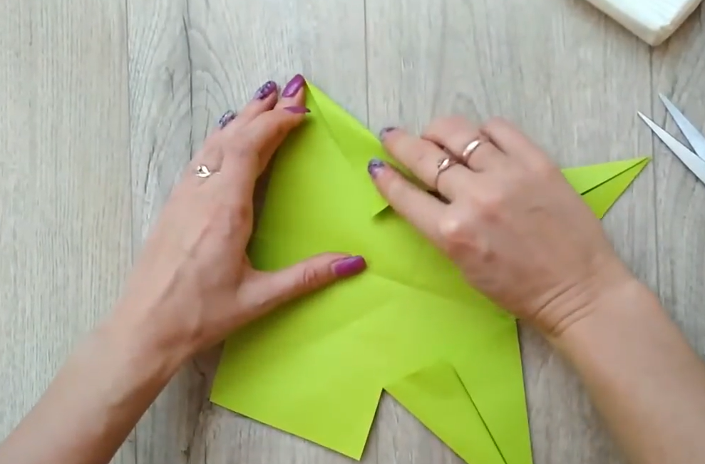 - заготовку складывают по диагонали справа налево, одновременно делая еще одну складку сбоку;
