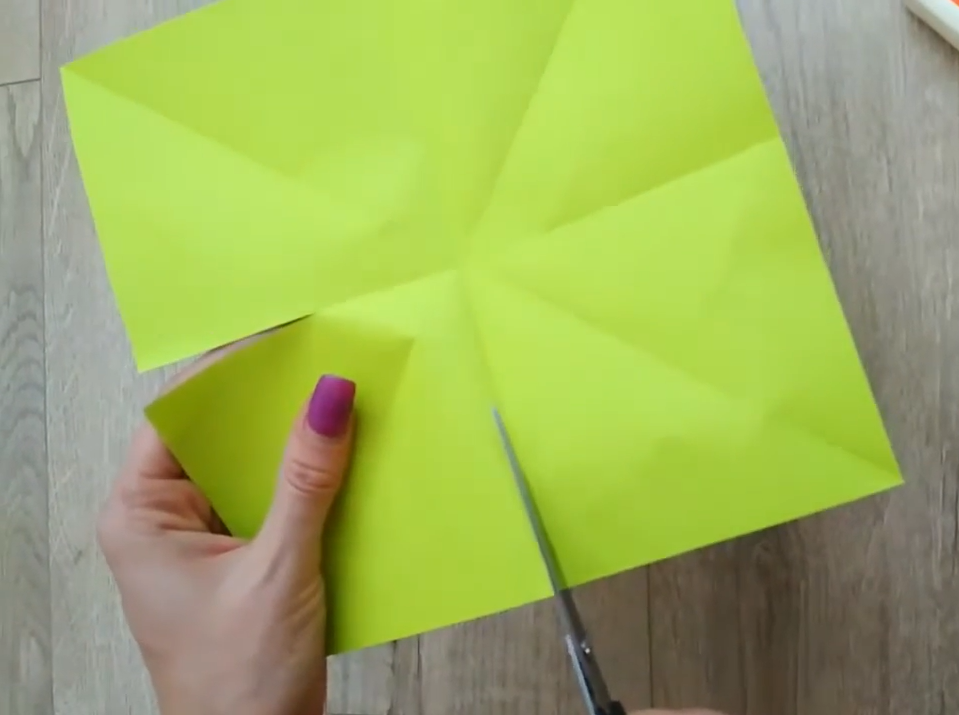 - лист бумаги размером 20х20 см складывают пополам по диагонали с 2-х сторон и посередине, затем распрямляют;