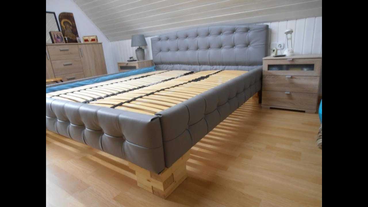 Эту кровать я увёз на дачу. А для своей спальни изготовил другую модель, немного отличающуюся шириной корпуса. Новую кровать с подъёмниками собрал своими руками размерами 180 × 200 см. В этот раз корпус изготовил из ЛДСП. Подложив тонкий поролон, покрыл внешние поверхности корпуса экокожей. Сделал это с помощью степлера. Получилось очень красиво и недорого.