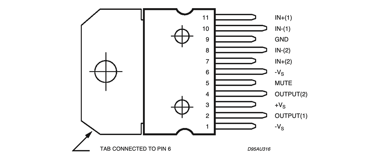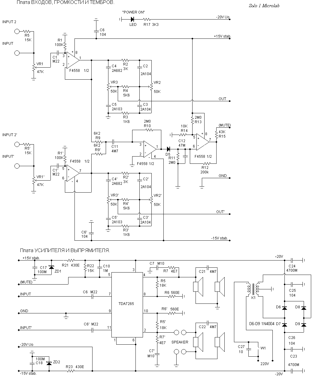 Далее идёт ёмкостной фильтр из двух конденсаторов С23 и С24 (или C17 и С18 на плате усилителя, в разных схемах обозначены по разному) 4700мФ на 25В (почему их стоит поменять), сглаженное напряжение которого (±Vcc 20 В) питает микросхему стереоусилителя TDA7265 (скачать даташит).