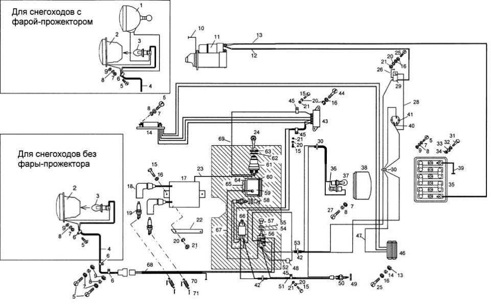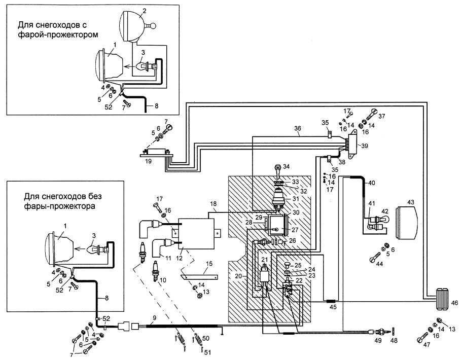 На устройстве снегохода используется комбинированная система электронного оборудования (ЭО) напряжением 12 В; один провод для заднего фонаря, для другого ЭО — два провода.