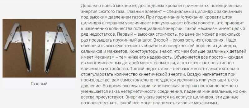 От их функциональности и надежности во многом зависит комфортность пользования кроватью. Всего существует три вида механизмов для подъёма: