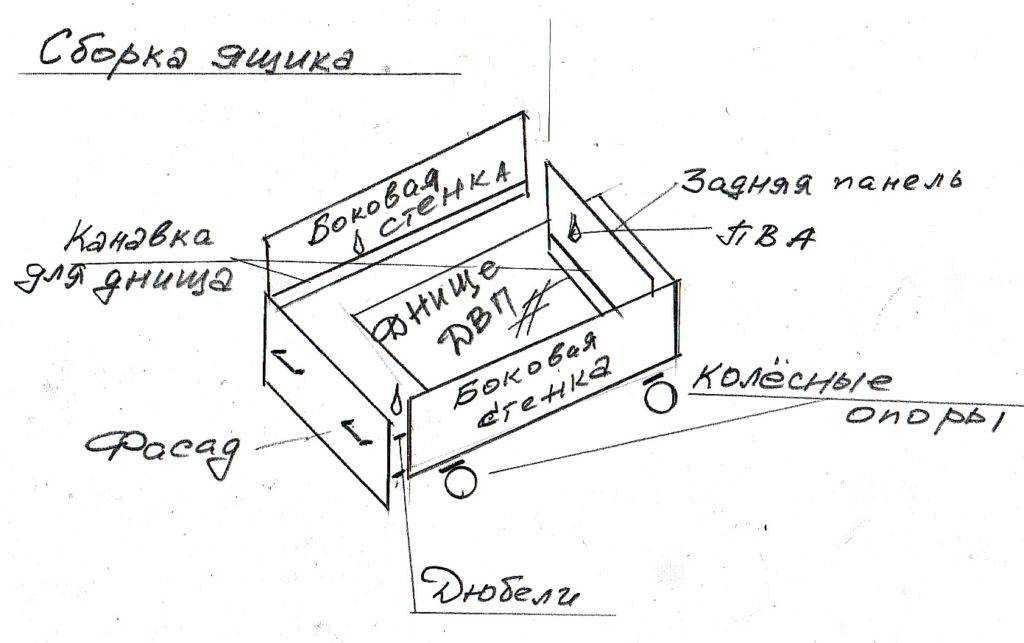 Следует гвоздями прибить дно ящика и прикрутить направляющие фото 12. Направляющие прикручиваются в упор к фасаду.
