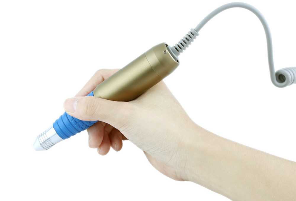 Домашний маникюрный фрезер обладает неплохой мощностью и поддерживает скорость от 3000 до 25000 оборотов. Поставляется вместе с пятью насадками с сапфировым покрытием, есть опция реверса и система охлаждения. Пользоваться ручкой-фрезером для маникюра можно для снятия гель-лака с ногтей, шлифовки пластин и ухода за кутикулой.