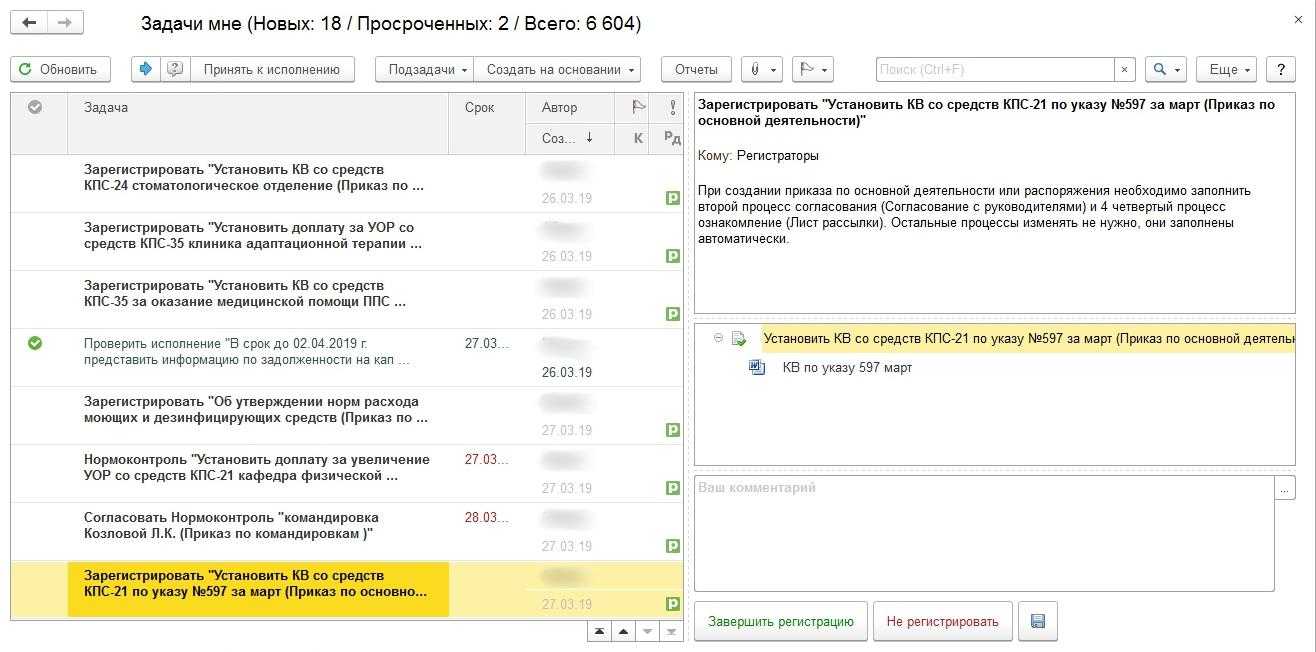 Рисунок 3. Рабочий стол для работы с задачами в системе «1С:Документооборот».