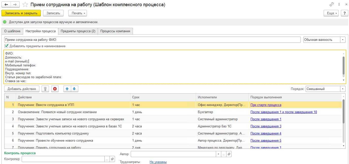 К примеру, процесс приема сотрудника на работу, который включает в себя все действия (от сканирования личных документов до аттестации по окончании испытательного срока), при этом заранее определены сроки исполнения каждой задачи, в каждой задаче прописана инструкция для исполнителя и критерии оценки результата. В итоге мы получаем качественно проведенный прием сотрудника, с формированием кадровых документов и размещением их в архив, организацией учетных записей и рабочего стола сотруднику, проведение первичного обучения и формирование персонального плана развития. Каждый участник процесса приема сотрудника на работу знает, что ему делать, как это делать и в какие сроки