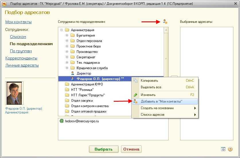 Способ 1. Выбрав адресата в списке, используйте команду Добавить в Мои контакты (см. рис. 14).