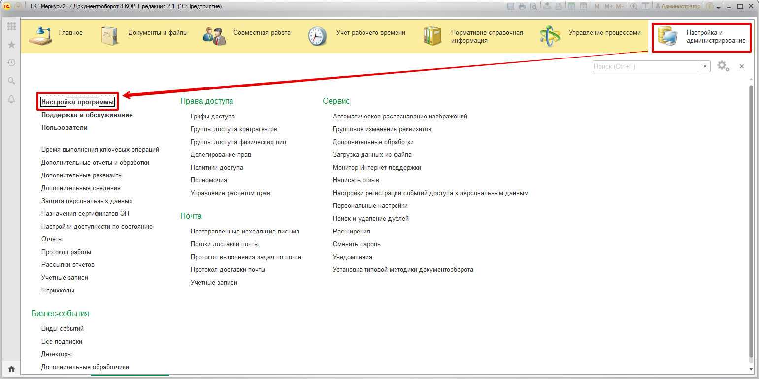 — Создание папок внутренних документов.— Настройка прав доступа.— Ввод информации о корреспонденте.— Создание шаблонов автозаполнения документов.