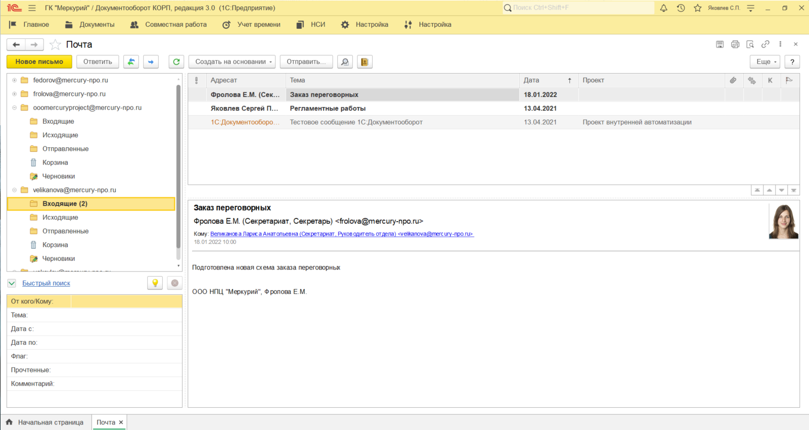 Встроенная почта – это полноценный почтовый клиент, встроенный в «1С:Документооборот». Все письма, прикрепленные к ним файлы и история переписки хранятся в информационной базе.