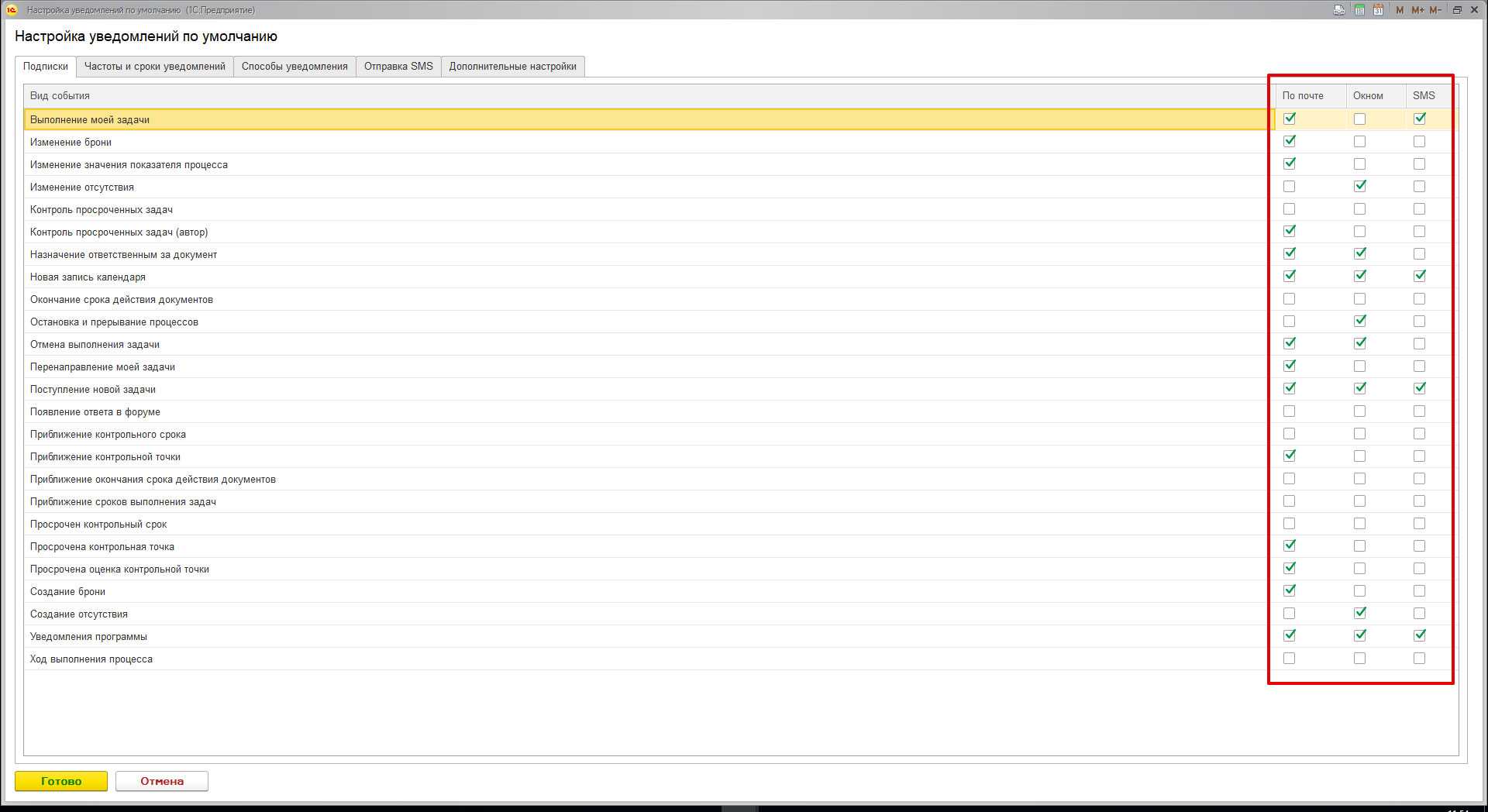 На первой вкладке рабочего места настроек уведомлений по умолчанию настраиваются виды событий, по которым требуется уведомления тем или иным способом. Способов отправки в системе существует три: отправка уведомлений на почту электронным письмом, всплывающим окном и СМС-сообщением.