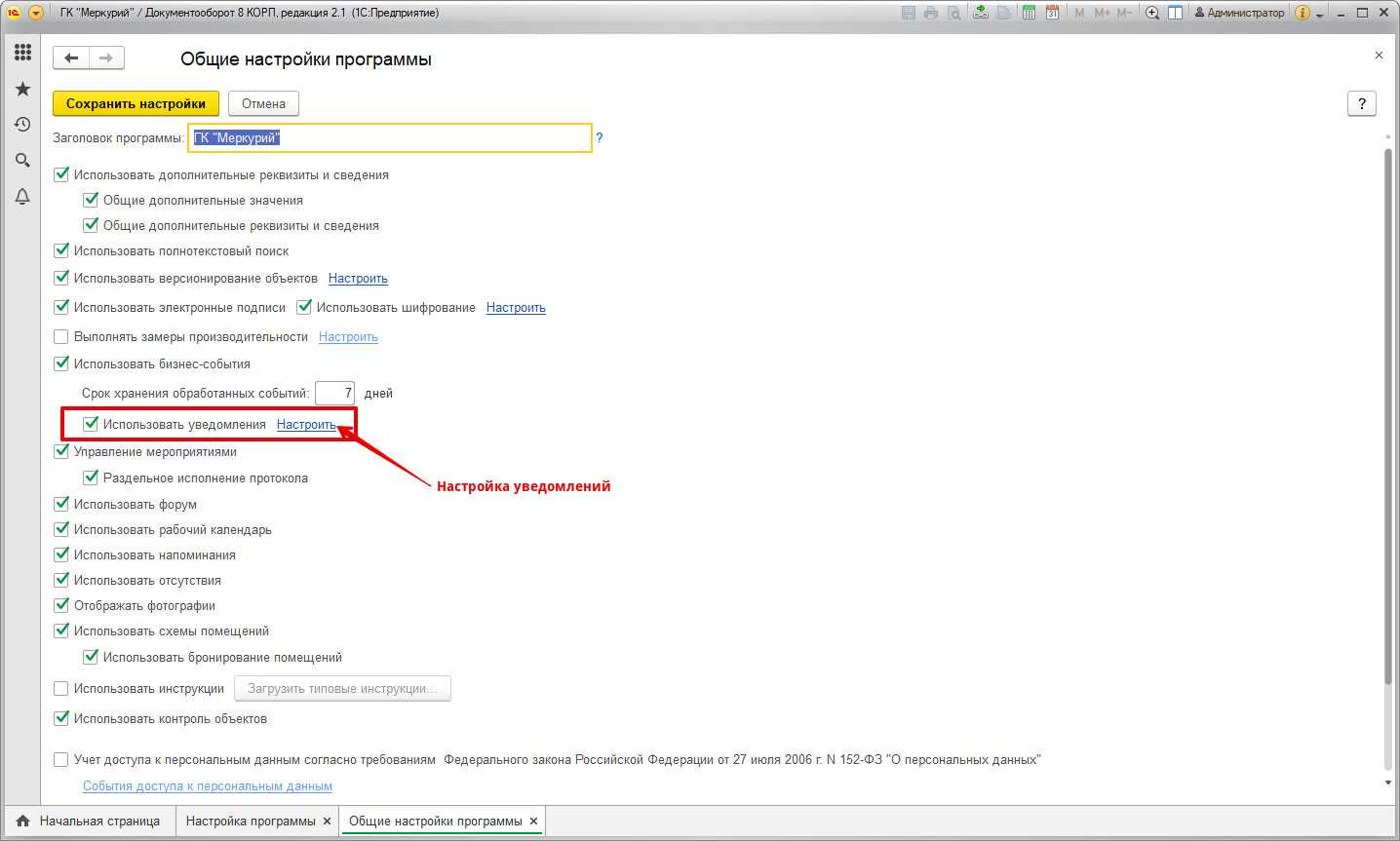 Чтобы произвести начальные настройки уведомлений в системе, администратору необходимо в разделе «Настройка и администрирование» перейти в меню «Настройки программы-Общие настройки программы».