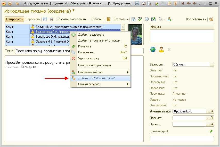 - Подготовьте исходящее письмо и нажмите Добавить получателей списком в контекстном меню списка получателей;
