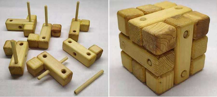 Головоломка из дерева кубик со штырьками. Делается из дерева, нужны инструменты для распиливания. Получившиеся мелкие детали нужно собрать в кубик, потом снова его разобрать-собрать и т.д. развивается мелкая моторика рук и пространственное мышление.