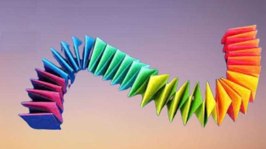 Движущееся оригами из сложенных определенным образом полосок разноцветной бумаги послужит головоломкой не только для детей, но и для взрослых.