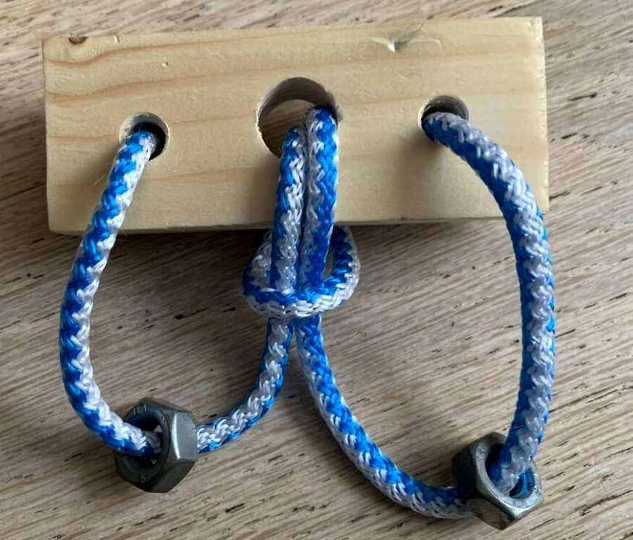 Головоломка из деревянной дощечки, веревки и гаек. Размеры могут быть любыми, получаются 2 веревочные петли с гайкой на каждой. Чтобы решить головоломку, следует переместить обе гайки на одну петлю, не развязывая веревку.