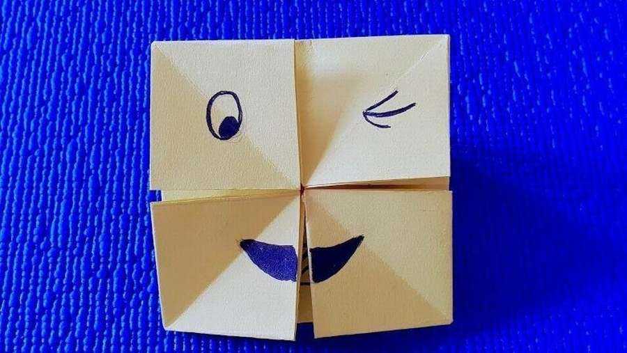 Головоломка из бумаги оригами «Меняющееся лицо». Четыре лица нарисованы на сложенном листе. Складывая поделку определенным образом, можно видеть одно из них.